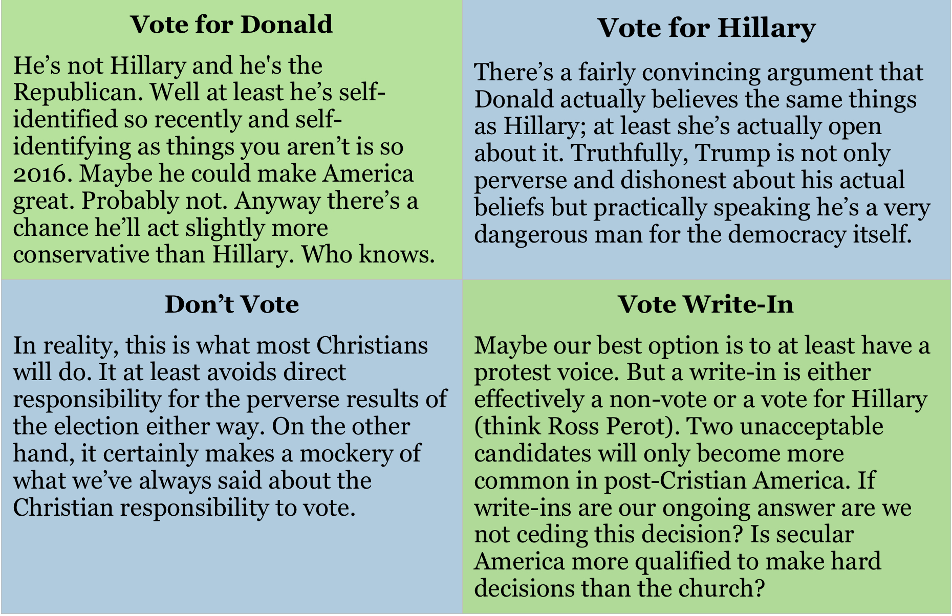 It’s now a fait accompli—Donald Trump represents the Republican party. We’re now witnessing the Great Evangelical Predicament. For the last few months we’ve all condemned Trump (as we should) and built the case that Christians shouldn’t vote for him under any circumstances. Except now it’s Hillary or him. The Great Predicament will be the collective evangelical mind trying to figure out what to do, including possibly how to rationalize voting for a serially divorced, adulterous, self-absorbed casino owner. Closer reflection reveals four very bad choices.
